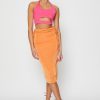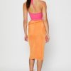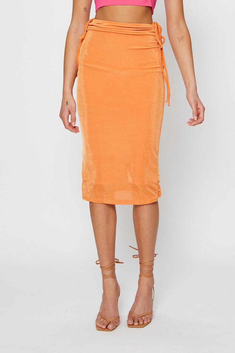 Features: Ruched Sides, Midi Length, Stretch Material, Tie Detail